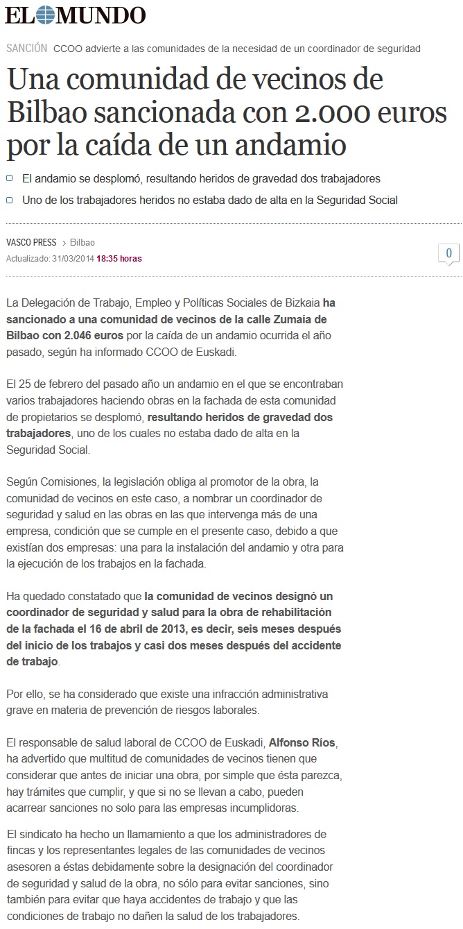 Una obligación, normalmente desconocida por representantes y/o gestores de las Comunidades de Propietarios, es la de designar un Coordinador de Seguridad y Salud (CSS) en Fase de Ejecución, cuando las obras supongan la participación de más de una empresa (contratista/s + subcontratista/s), que es en la mayor de los casos. Por eso desde SALPEVI ponemos a su servicio nuestro personal cualificado para la ejercer dichas funciones, lo que evitará responsabilidades del Promotor en esa materia, además de asegurar la correcta ejecución de las obras, especialmente en lo que a materia preventiva y de seguridad de los trabajadores, se refiere.